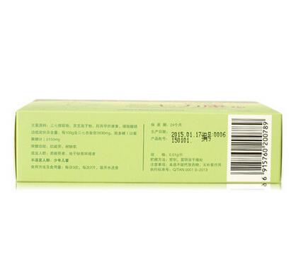 主要原料:三七提取物、靈芝孢子粉、羥丙基纖維素、硬脂酸鎂。