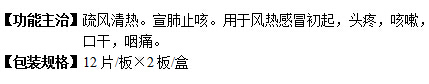 用于風(fēng)熱感冒初起,頭疼,咳嗽,口干,咽痛。