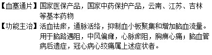 【功能主治】活血祛瘀,通脈活絡,抑制血小板聚集和增加腦血流量。用于腦路遇阻,中風偏癱,心脈瘀阻,胸痹心痛;腦血管病后遺癥,冠心病心絞痛屬上述癥狀者。