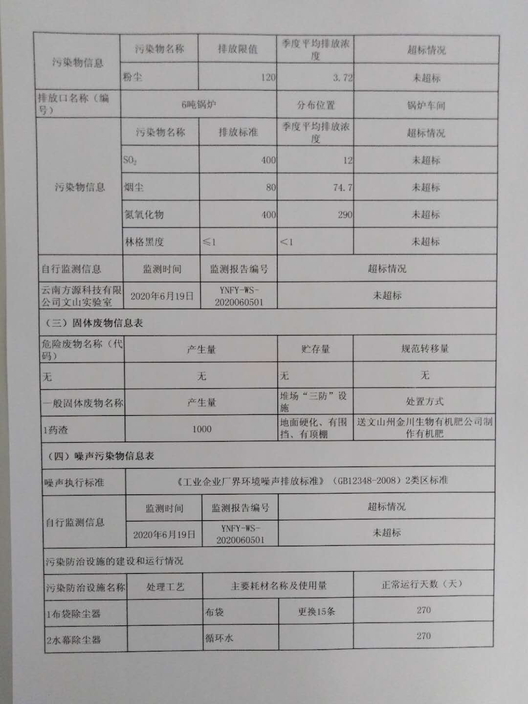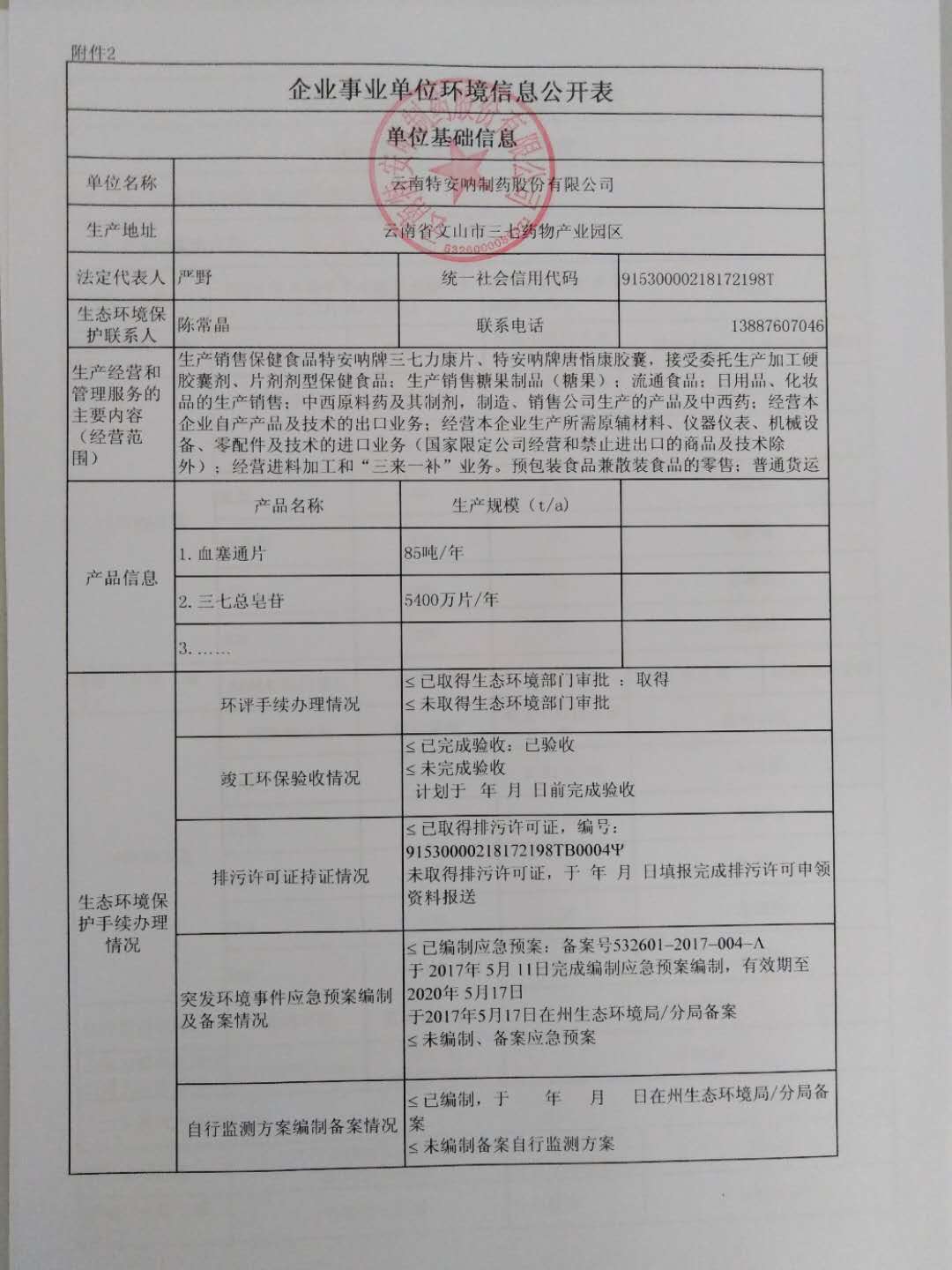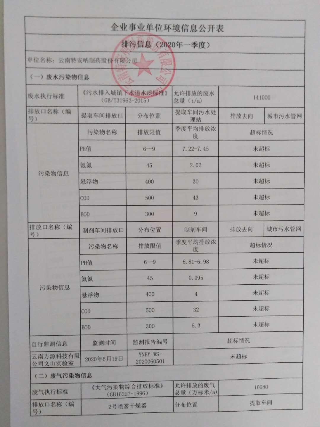 云南特安吶制藥股份有限公司2020上半年環境信息公開