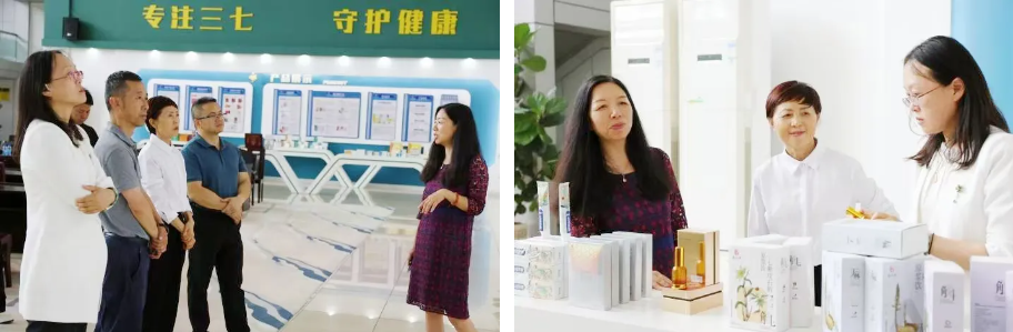 調研組一行首先參觀了公司企業文化展廳,詳細了解特安吶的發展歷程、科研成果轉化、企業文化建設及主打產品矩陣。鄒慧寧著重介紹了公司在三七總皂苷提取、人參皂苷單體分離純化等關鍵技術領域的創新突破。公司依托四大國家級平臺,構建起從原料到產品轉化的全鏈條創新體系。丹參益心膠囊、七生力片、七生靜片、調經養顏膠囊四個全國獨家產品是公司深耕三七產業多年的成果,其標準化的工藝與顯著療效,充分展現了特安吶在中藥現代化領域的深厚積淀。